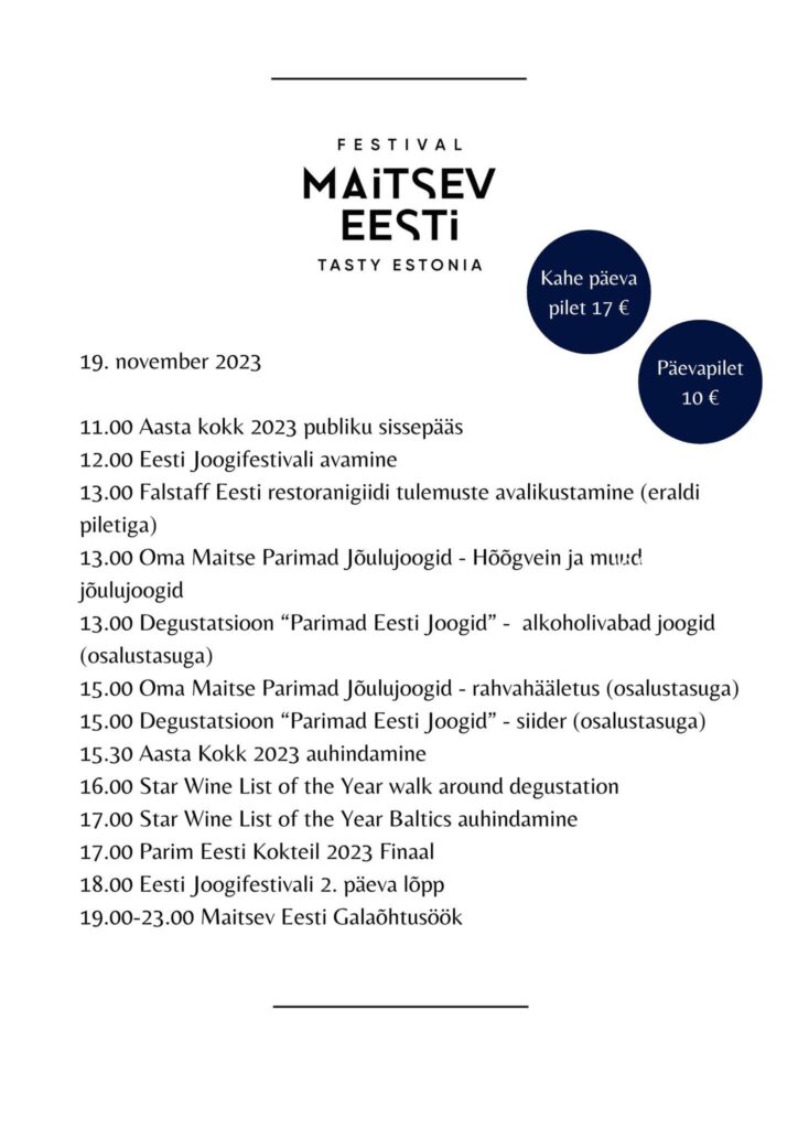 – Eesti Maitsed ja International Restaurant Guide Falstaffi Eesti parimate restoranide avalikustamine (eraldi piletiga).