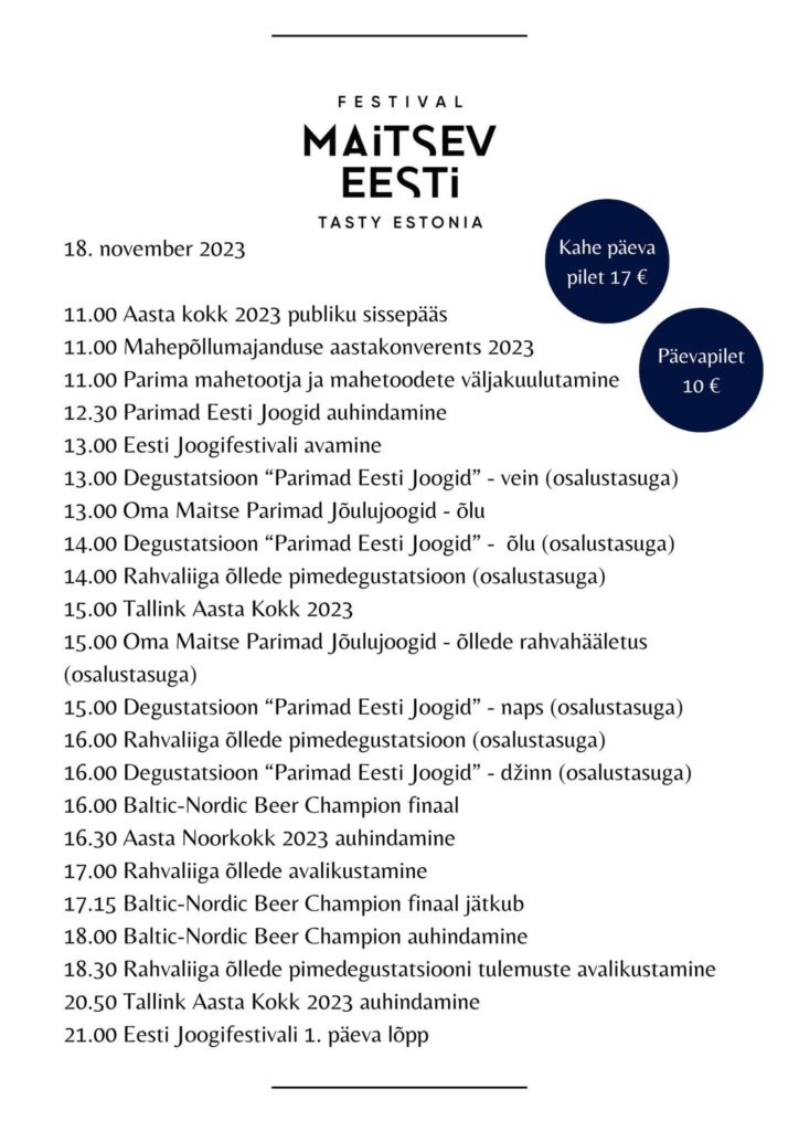 – Parimad Eesti Joogid 2023 degusteerimised, kus saab kiirelt ja mugavalt tutvuda parimatest parimate kodumaiste jookidega sümboolse osalustasu eest. Degustatsiooni programm on leitav all olevas ajakavas.